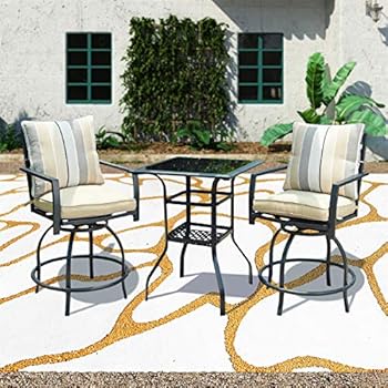 If you are looking for a nice bistro set for your balcony then check this one from Nuu Garden brand. The set features a 31 1/2 x 31 1/2 inch table and two comfy bar height swivel chairs. The table has rounded corners and a sleek tempered glass top.