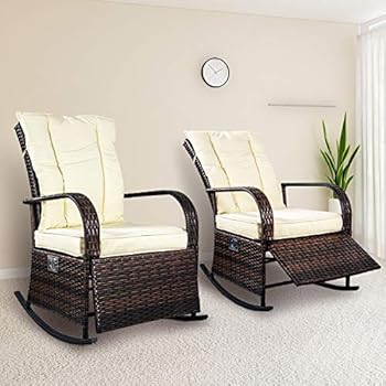 SCYL Color Your Life Set of 2 Indoor & Outdoor PE Wicker Rocking Chair Porch Garden Lawn Deck Auto Adjustable Rattan Reclining Chair Patio Furniture w/Water-Proof Cushion(Beige)