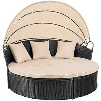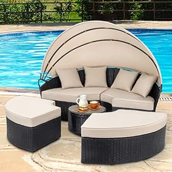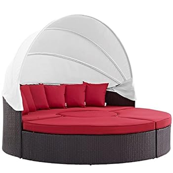 These day beds have a round shape. Typically, their canopy is retractable which means that it can be drawn back or back in. Their rounded silhouette has a calming effect. In addition, if you have small children, then an outdoor circular daybed with canopy is safer than other patio daybeds. Generally, a round outdoor daybed with a retractable canopy is a good choice for most patios.