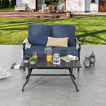 Giantex Patio Loveseat with Coffee Table Outdoor Bench with Cushion and Metal Frame, Loveseat Porch Furniture Set Sofa for Garden, Yard, Patio or Poolside (Navy & Black)