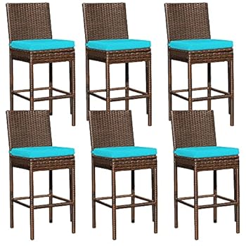 Sundale Outdoor Bar Stools Set of 6, 6 Pieces Woven Wicker Bar Stools Armless, Patio Bar Chairs with Pillow & Blue Cushion, All-Weather Outdoor Patio Furniture – Steel, Brown