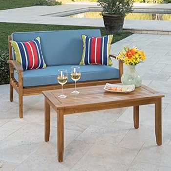 Christopher Knight Home Peyton Outdoor Acacia Wood Loveseat and Coffee Table Set with Water Resistant Cushions, Teak Finish / Blue