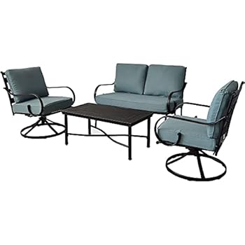 Hanover 4-Piece Light Blue Montclair Weather Outdoor Patio Chat, 2 Swivel Rocker Side Chairs, Loveseat, and Coffee Table, Thick Cushions, Conversation Set