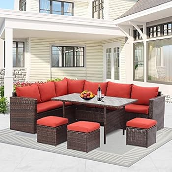 Solaste 7 Piece Outdoor Patio Furniture Set, All Weather Wicker Dining Table Chair Set, Patio Furniture Sectional Conversation Set with Ottoman Cushion,Light Red