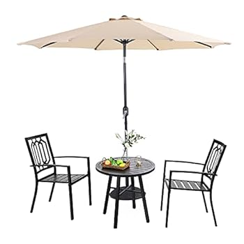 MFSTUDIO Classical 4 Pieces Patio Bistro Set with 9 ft Outdoor Market 8 Ribs Patio Umbrella, 4-Piece Steel Outdoor Table Furniture Set – 2 x Outdoor Chairs, 1 x Coffee Table and 1 Large Beige Umbrella