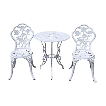 These bistro sets are affordable and ideal for small spaces. The majority of them are 3 piece bistro sets. As for the white color, it is a classic furniture color that was, is and will be popular and in style. White is a neutral color that has associations with purity and cleanliness. What’s more, it’s a classy color and looks great when used as a bistro set color in outdoor living spaces because the natural light favors it.