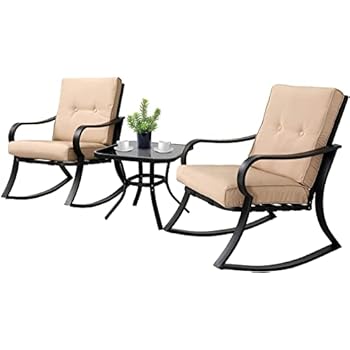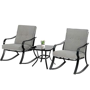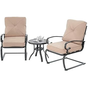 If you are looking for a nice-looking and affordable small patio bistro set, then this set from Oakmont brand is one of our favorites. It is a three-piece comfy bistro set with a modern style that features a sleek round table and two comfy black C-shape spring chairs that have a slight rocking motion. The seat and back cushions are made of Olifen fabric, they are 3.9″ thick and have a bold orange to red color. If you are not fan of red colors you can find this set with blue or brown cushions. It is an easy to put together patio bistro set and, most importantly, it is affordable!