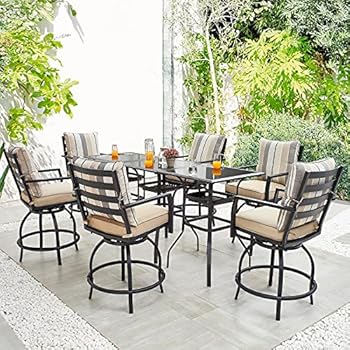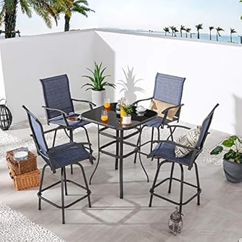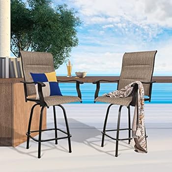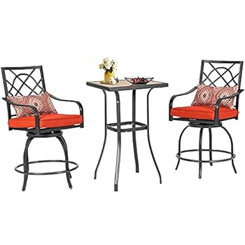 A value-for-money set of patio furniture is what most shoppers are looking for. We found out that the bistro set from PHI VILLA is one of them. It includes two high top chairs and a nice-looking bar bistro table. The two chairs have a brown padded fabric and a fun swivel design that enables them to rotate 360 degrees. Each chair has a 29.9″ seat height, 21.5″ back height, curved arms and can hold up to 300 lbs. weight with comfort. Additionally, both chairs feature handy knobs that you can use to configure their height.